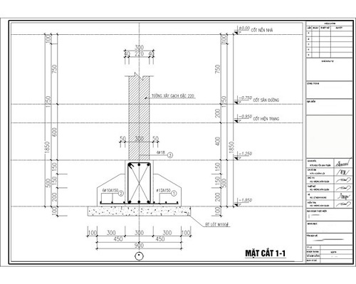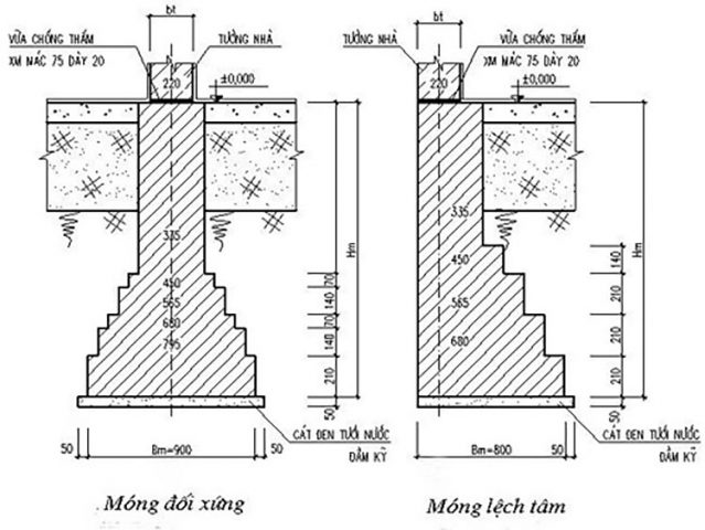Chiều rộng đỉnh móng phải lớn hơn kết cấu bên trên 1 cấp, ví dụ tường 220mm thì đỉnh móng khoảng 335mm,