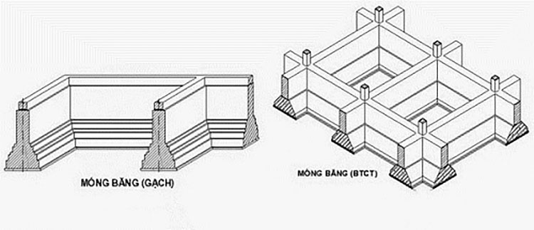 Móng băng: Là dạng dải dài, độc lập hoặc giao nhau, thường được thi công bằng cách đào quanh khuân viên xây dựng công trình hoặc đào song song trong khuân viên đó. Là loại móng nông, xây trực tiếp trteen hố đào rồi lấp lại.