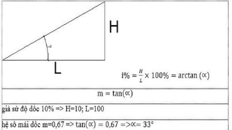 Ngoài độ dốc i, xong xây dựng người ta còn phải tính đến độ dốc m nữa, độ dốc m thường được các bác thợ nề tính theo phương pháp truyền thống là: M=h/2L.