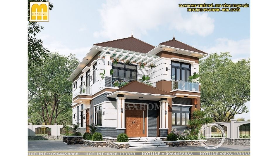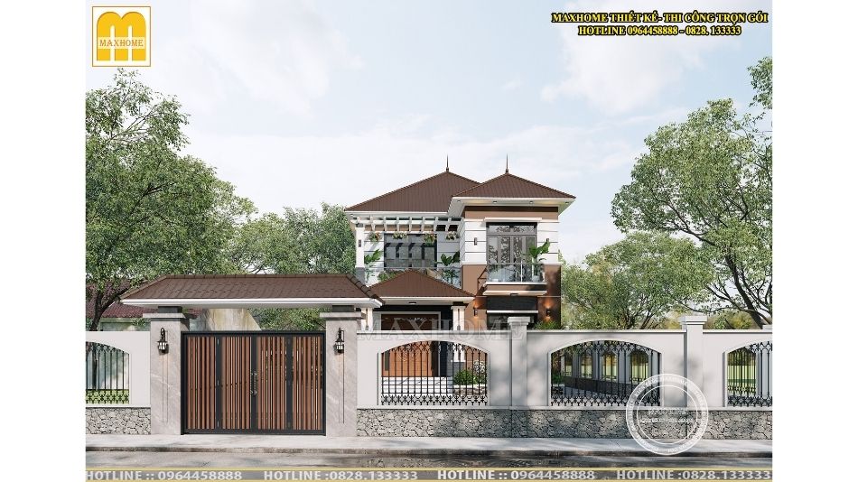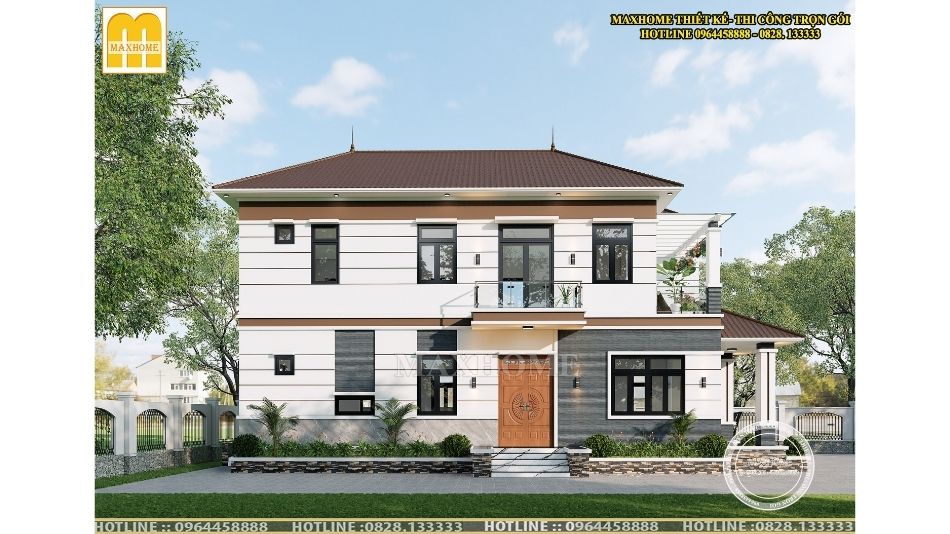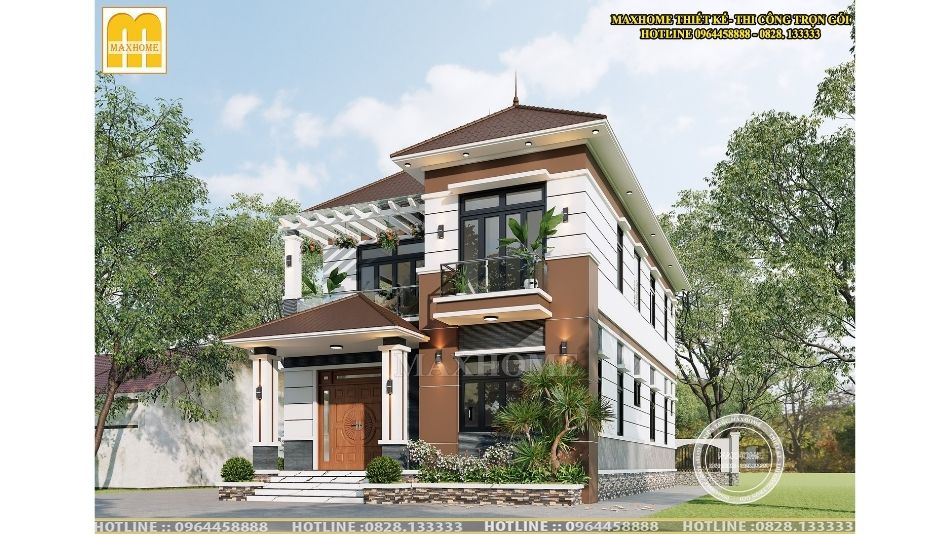 Đây là mẫu nhà được thiết kế đơn giản nhưng không kém phần sang trọng và bề thế, mang lại không gian sống thư thái, yên bình và gần gũi, bên cạnh đó vẫn toát lên vẻ đẹp hiện đại. Màu sơn trắng chủ đạo kết hợp với màu nâu của phần mái và 1 số mảng tường giúp tăng thêm tính thẩm mỹ cho ngoại thất công trình.