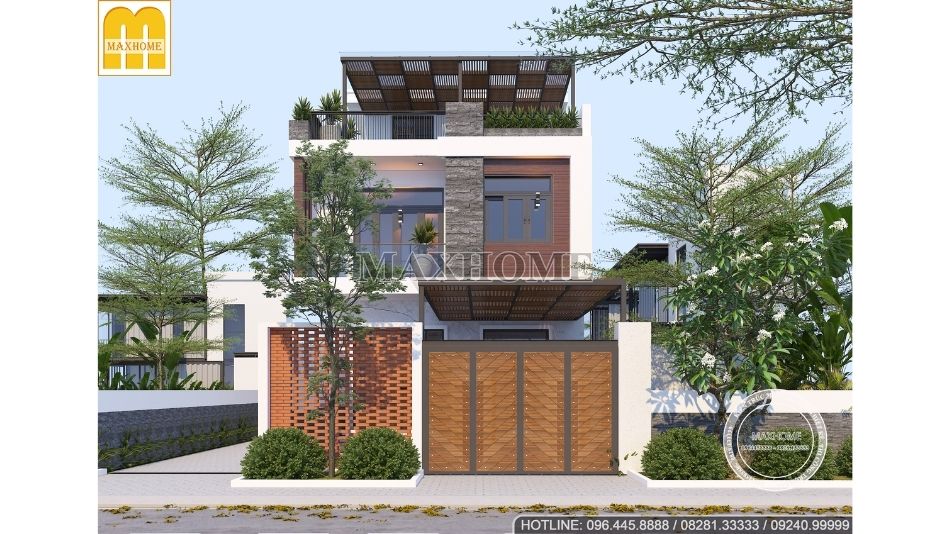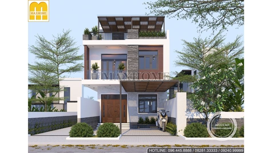 Khác với những mẫu nhà truyền thống, những công trình hiện đại sử dụng rất nhiều những vật liệu xây dựng tiên tiến như bê tông, kính,… và vật liệu trang trí khác. Ở đây, chúng ta thấy mặt tiền tầng 1 có sự xuất hiện của gạch giả đá, chân tường và cột trang trí ở tầng 2 có sự góp mặt của đá chẻ. Lan can ban công ở tầng 2 được làm từ kính cường lực, trong khi đó lan can ban công ở tầng tum sử dụng sắt hộp sơn tĩnh điện. Mái che ở tầng tum và ngay vị trí đỗ xe được làm từ gỗ nhựa khung thép sơn tĩnh điện vừa có tác dụng che nắng vừa có giá trị thẩm mỹ cao.