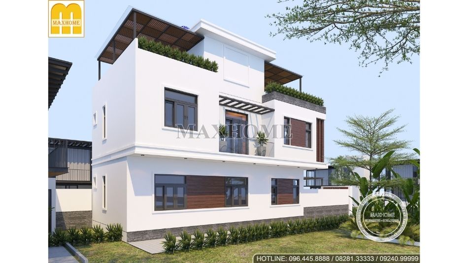 Từ những ánh nhìn đầu tiên, chúng ta có thể thấy được hình khối kiên cố, chắc chắn nhưng không hề nhàm chán, ngược lại rất ấn tượng do việc khéo léo sử dụng màu sắc và các vật liệu trang trí. Công trình này thể hiện rất rõ những đặc điểm của phong cách hiện đại, đề cao sự đơn giản và hướng đến vẻ đẹp tinh tế. Màu sắc chủ đạo của ngôi nhà là màu trắng, màu sắc điểm nhấn là màu nâu của gạch giả gỗ. Sự kết hợp giữa 2 màu sắc này mang đến cảm giác trang nhã, ấm áp và sang trọng.