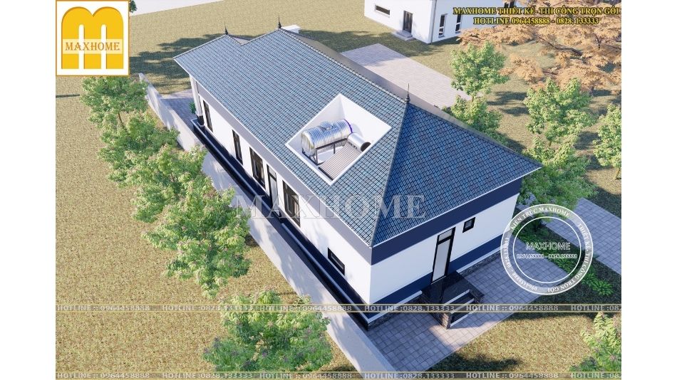 Phía trên mái có tạo 1 ống khói giả tăng thêm vẻ đẹp cho công trình. Ở phần mái còn có tạo 1 ô để téc nước và thái dương năng để phục vụ sinh hoạt cho cả gia đình.