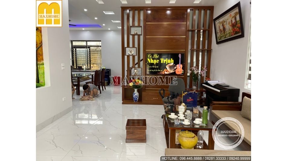 Nội thất thiết kế chuẩn phong cách hiện đại, đơn giản nhưng đầy tinh tế. Không quá nhiều chi tiết hoa văn rườm rà. Căn phòng khách được ngăn với cầu thang bởi một hệ vách ngăn gỗ công nghiệp. Đây là một sự gợi ý sáng tạo để không khiến không gian nhà bạn bị quá bí bách.