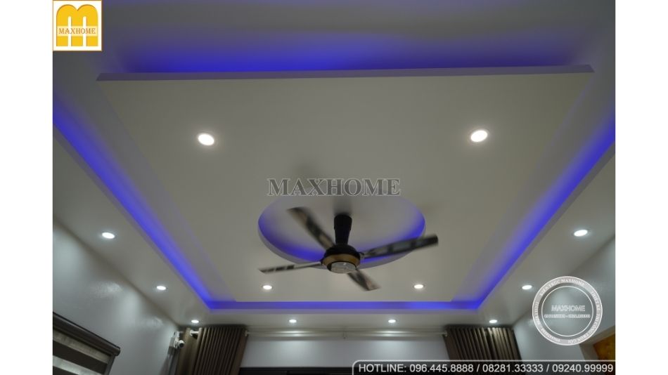 Trần nhà lắp đèn downlight xanh huyền ảo. Kết hợp với quạt trần được thiết kế lõm phía trên phù hợp với phong thuỷ, giúp tụ khí tài lộc trong nhà.