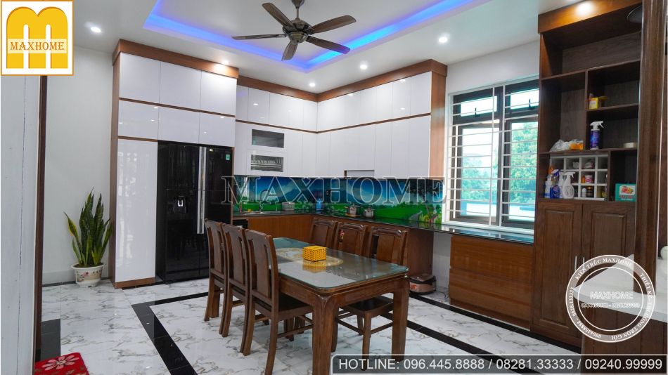 Liền kề với phòng khách là phòng bếp. Hai không gian này được ngăn cách với nhau bằng một hệ lam. Việc sử dụng kính ngăn cách giữa các không gian nội thất như thế này cũng khá hay, có thể tạo ra không gian mở, giúp ngôi nhà trở nên rộng rãi và có chiều sâu hơn. Khu vực phòng bếp được đặt 1 hệ tủ bếp hình chữ L, với thiết kế góc cạnh như thế này đã làm bật lên được phong cách đậm chất hiện đại.