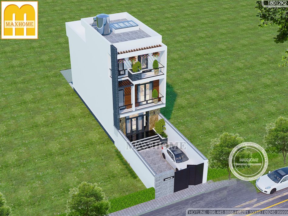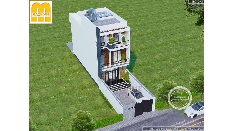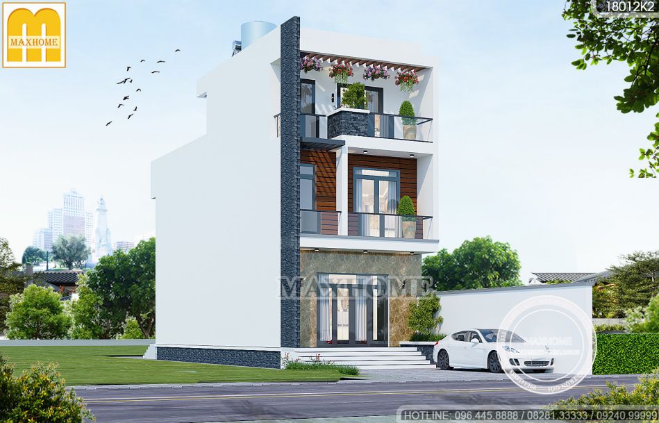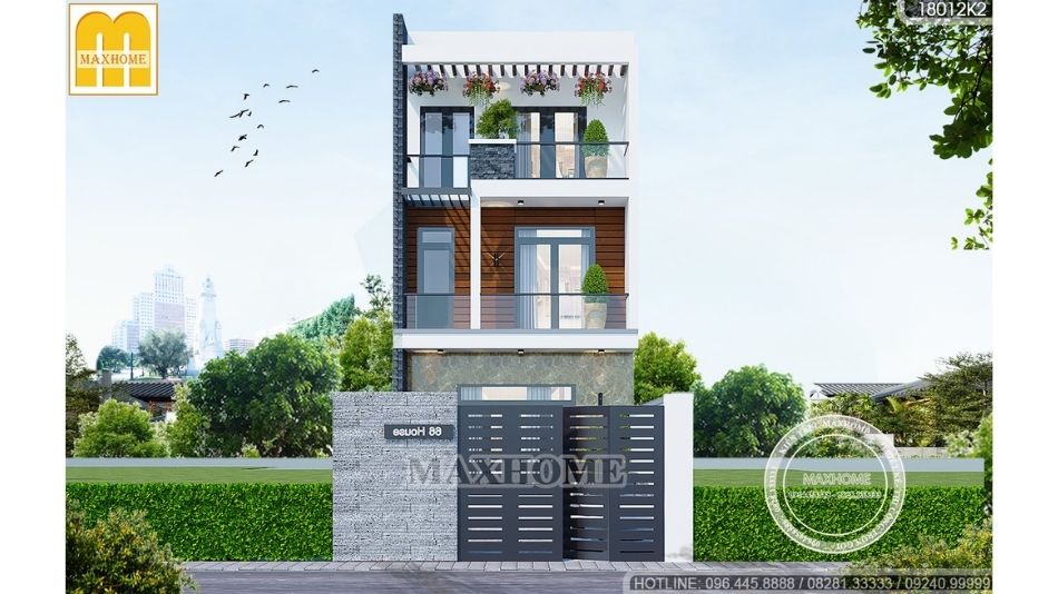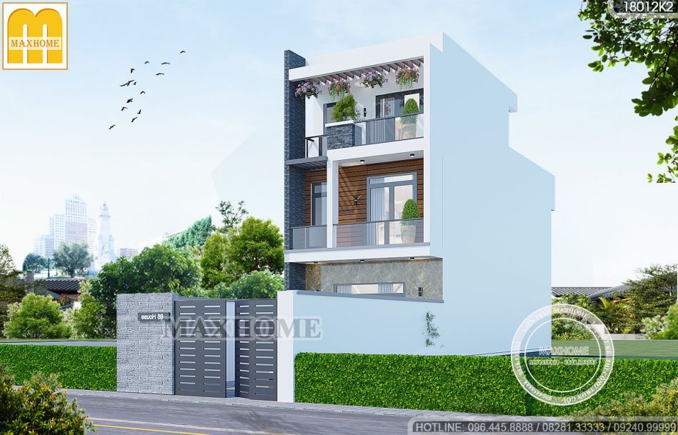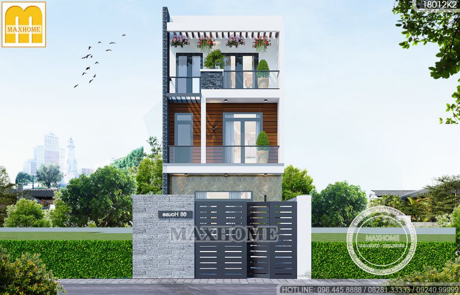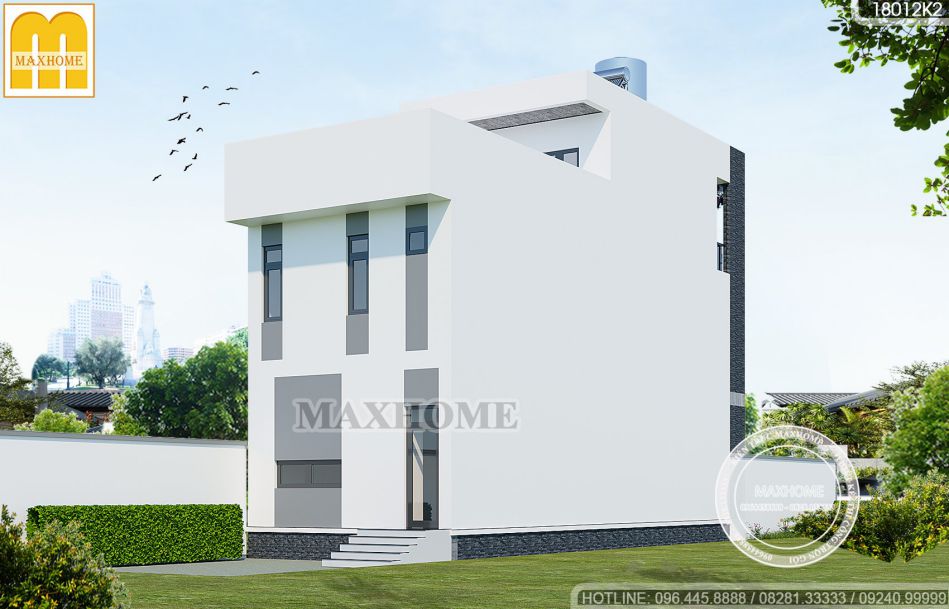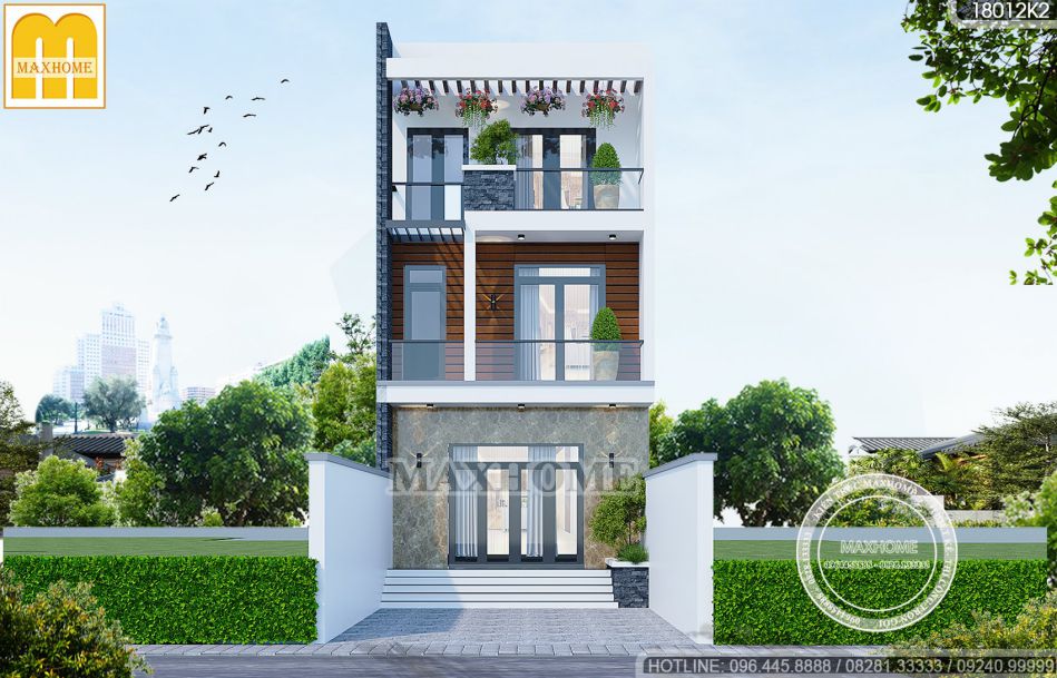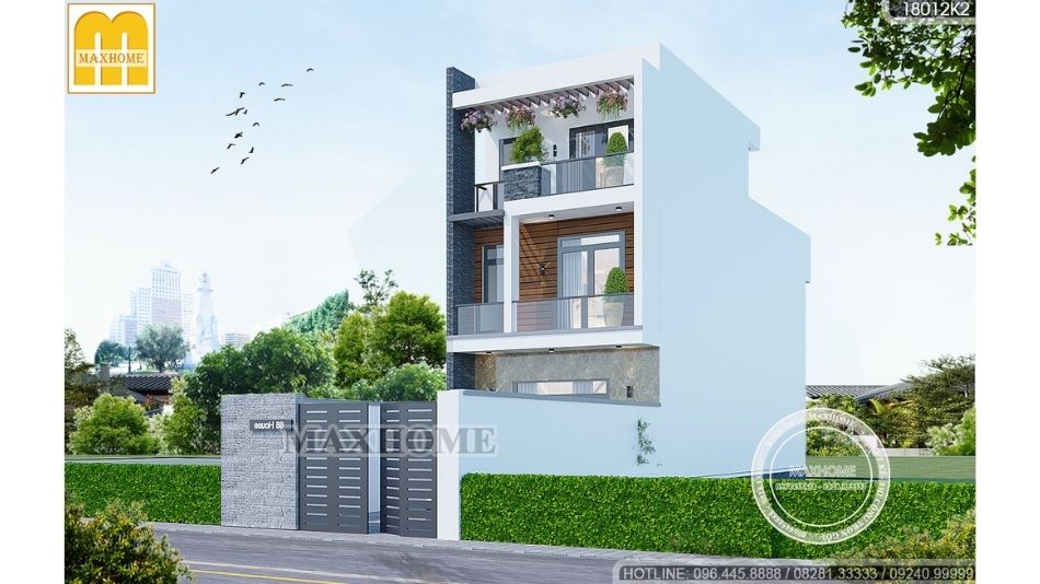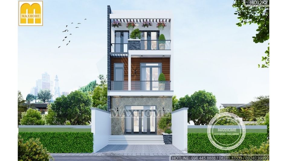 Mẫu thiết kế nhà hiện đại 5x19m 2 tầng 1 tum tại Chương Mỹ, Hà Nội. Maxhome giới thiệu đến bạn dự án thiết kế nhà ống có mỹ quan kiến trúc ấn tượng với phong cách trẻ trung, hiện đại.