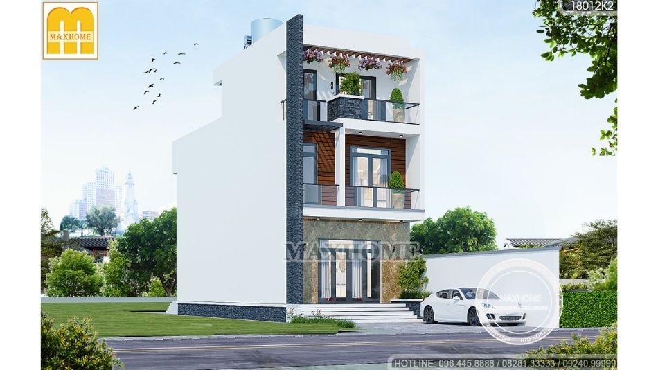 Căn nhà có một bức tường nhô ra phía bên tay phải giúp sự ngăn cách rõ ràng với nhà bên cạnh rõ hơn. Mỗi 1 tầng đều được lắp đặt ban công kính cường lực, tạo khoảng không gian thư giãn ngoài trời cho gia chủ.
