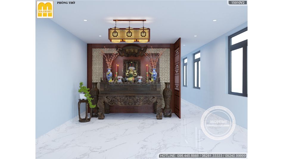 Khu vực tầng 2, đầu tiên chính là khu vực phòng thờ kết hợp với phòng sinh hoạt chung, có diện tích 24,4m2.