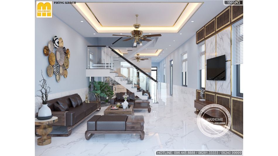 Phòng khách của ngôi nhà có diện tích 25m2. Phòng khách được đặt 1 bộ sofa với phần khung được làm từ gỗ sồi, bọc đệm da công nghiệp.
