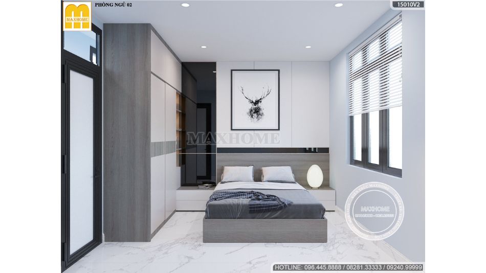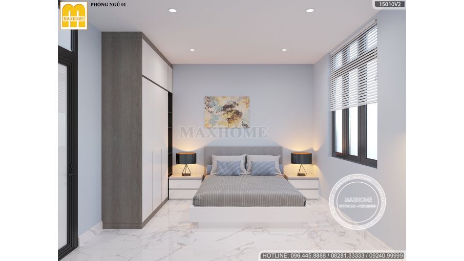 Phòng ngủ số 1, có diện tích 13m2. Phòng ngủ số 1 được thiết kế tối giản với gam màu trắng và trắng xám, giúp căn phòng trở nên rộng rãi và tinh tế hơn.