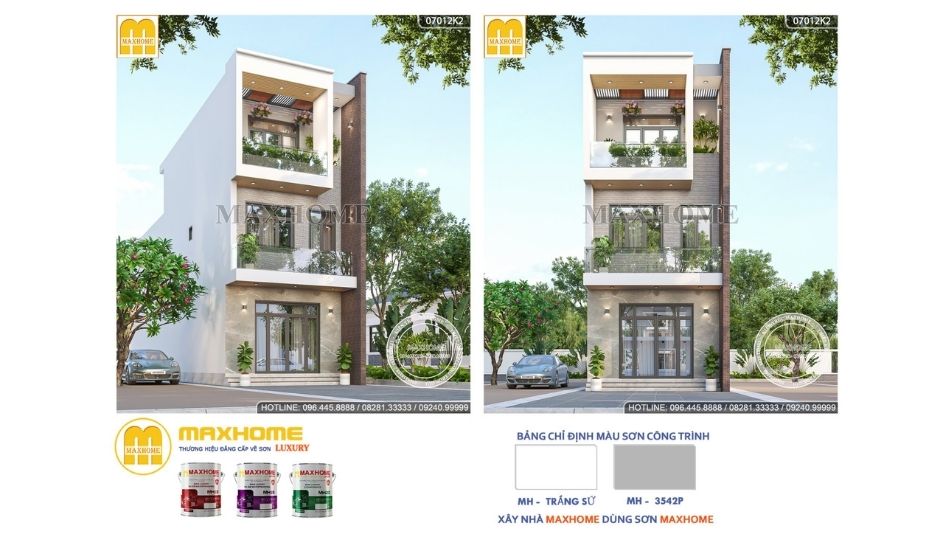 Phong cách thiết kế hiện đại hiện diện trong mẫu thiết kế này là màu sơn trắng và trắng xám, ở mặt tiền kết hợp cùng hệ thống hình khối hình chữ nhật đan xen hợp lý giữa các tầng với nhau. Điểm nhấn căn nhà nằm ở khu vực được sơn sẫm màu giả gỗ tạo nên chiều sâu không gian cho căn nhà, mang đến cảm giác ấm áp, sang trọng. Hệ thống đèn chiếu sáng lắp đặt giúp tạo cảm giác về không gian rộng cho mặt tiền của ngôi nhà.