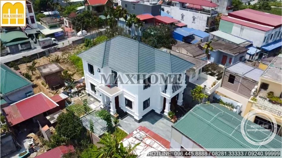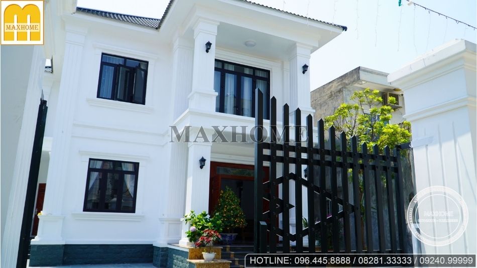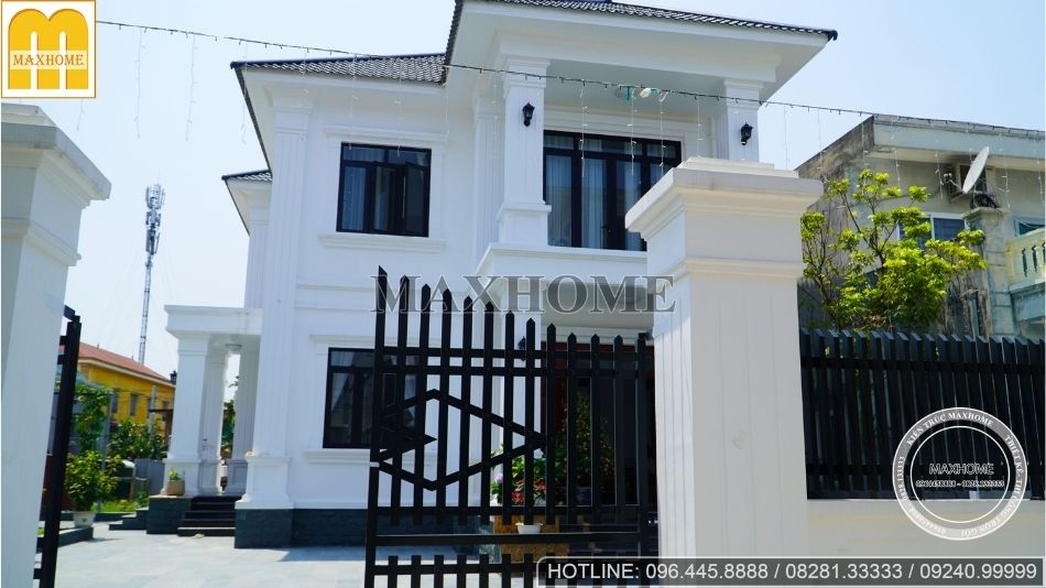 Toàn bộ ngôi nhà được sử dụng gam màu trắng. Một trong những màu sắc tinh tế, tối giản nhất hiện nay. Kết hợp với mái ngói màu ghi nổi bật. Trên hệ cột của ngôi nhà có những đường phào chỉ rất là nhẹ nhàng tạo cho ngôi nhà thêm phần nổi bật và tinh tế hơn.