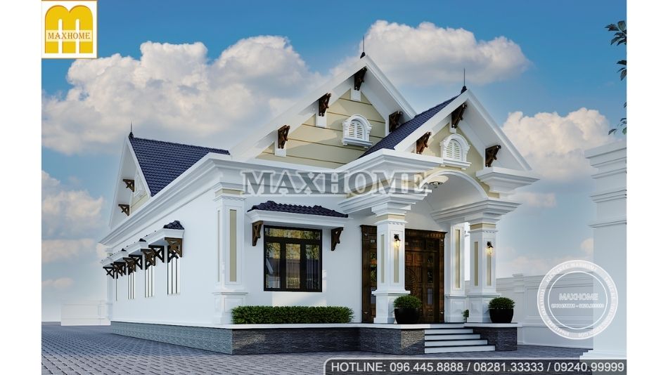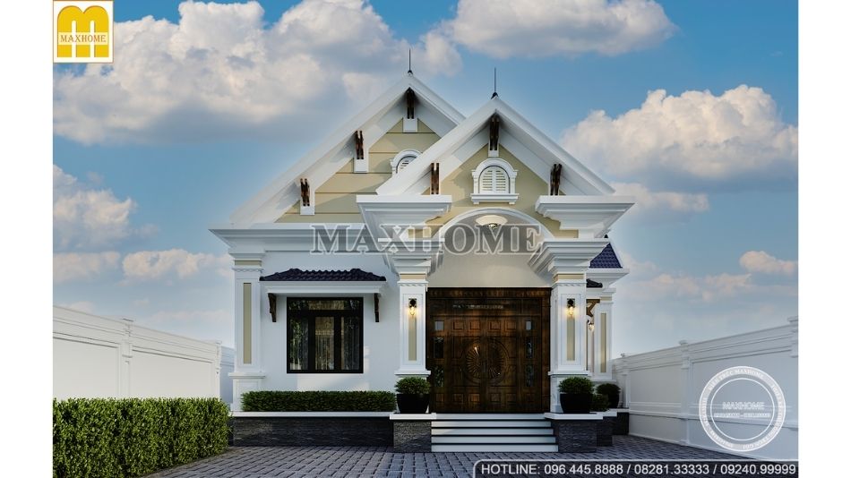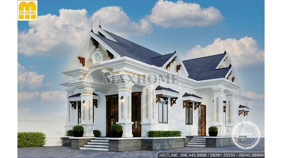 Ngôi nhà này thu hút người nhìn bởi hệ mái Thái bề thế cùng những chi tiết mang phong cách Tân cổ điển. Mái Thái không chỉ đẹp về thẩm mỹ mà còn có nhiều ưu điểm như khả năng chống nóng tốt vào mùa hè, chống thấm nước bởi có độc dốc cao.