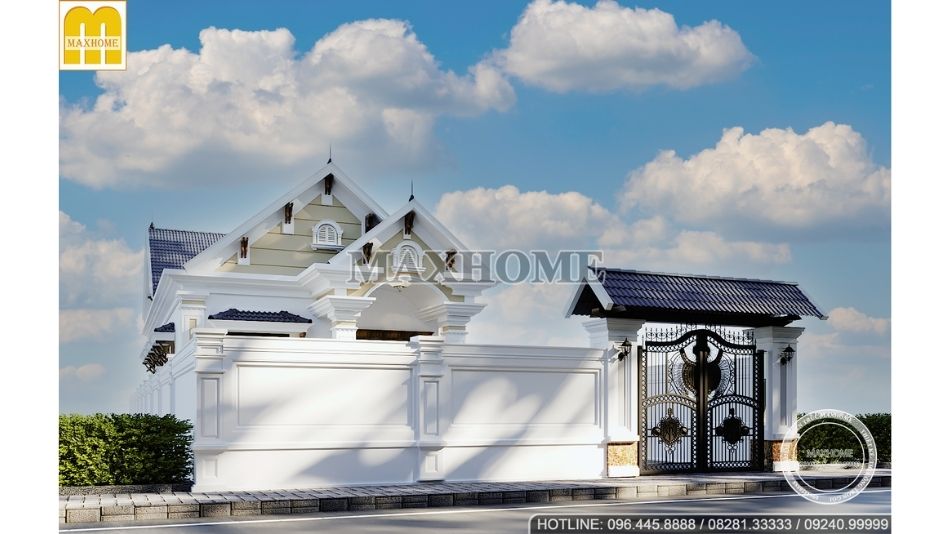 Di chuyển mắt ra xa hơn một chút, chúng ta sẽ thấy được hệ thống cổng và tường rào của ngôi nhà. Cổng được thiết kế với 2 cánh đóng mở, được làm từ sắt mỹ thuật với những đường nét hoa văn sống động, có giá trị thẩm mỹ cao. Phần mái cổng được tạo hình dốc, lợp ngói, đồng nhất với công trình chính bên trong.